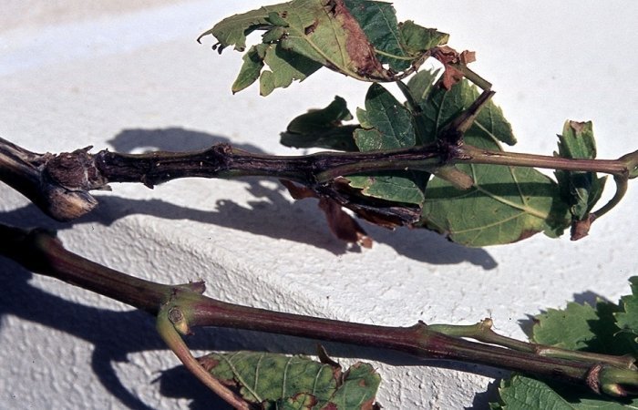 Προσβάλει κυρίως τις κληματίδες, τις κεφαλές, τους βραχίονες και τα φύλλα των πρέμνων. Μέσα σε 15 ημέρες από την έκπτυξη των βλαστών στα κατώτερα μεσογονάτια διαστήματα παρατηρούνται μαύρες κηλίδες που αργότερα νεκρώνονται. Κατά την διάρκεια της γρήγορης ανάπτυξης παρουσιάζονται σχισίματα και αποκτούν φελλώδη όψη. Το φθινόπωρο οι προσβεβλημένες κληματίδες αποκτούν λευκό χρώμα και η επιφάνειά τους γεμίζει από σφαιροειδή σωμάτια. Στα φύλλα παρατηρούνται μικρές γωνιώδεις νεκρωτικές κηλίδες και νεκρώσεις στους μίσχους. Παρατηρείται επίσης κακή έκπτυξη των οφθαλμών και νέκρωση των κεφαλών.